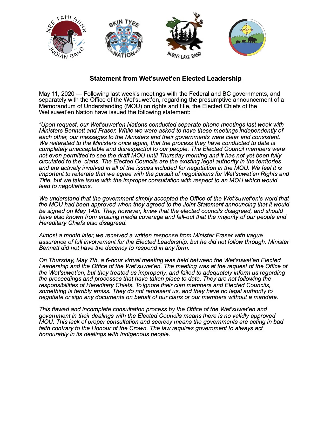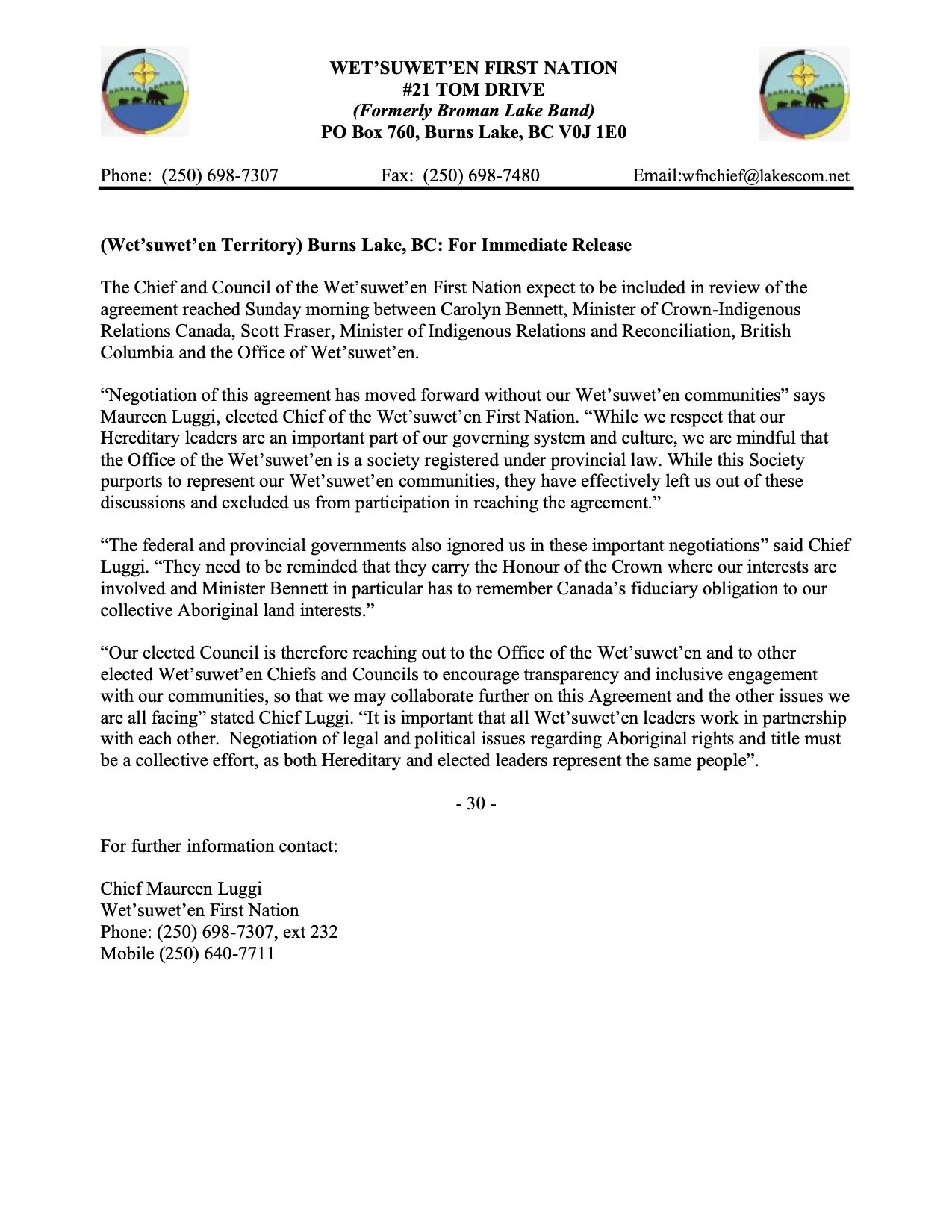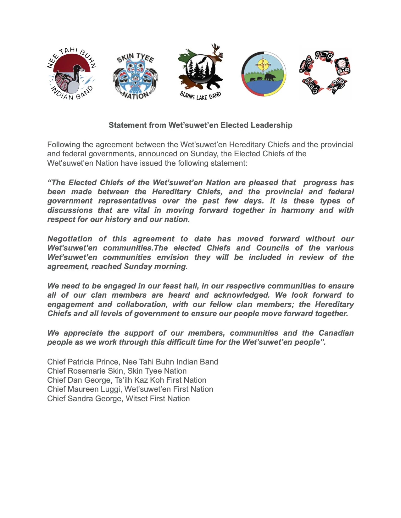 Once we have all had the opportunity to review the proposed agreement, we will work with the Hereditary Chiefs to ensure all members’ concerns are addressed before it moves forward.