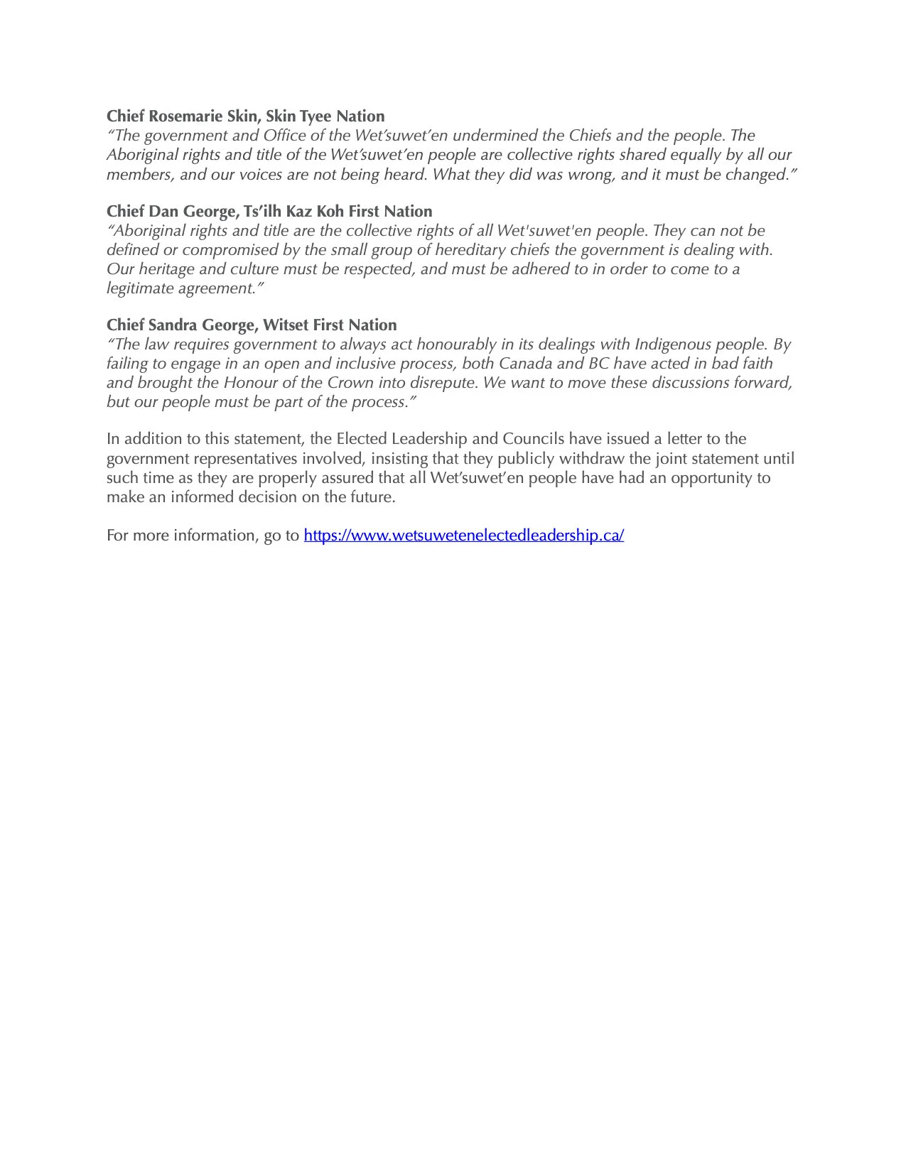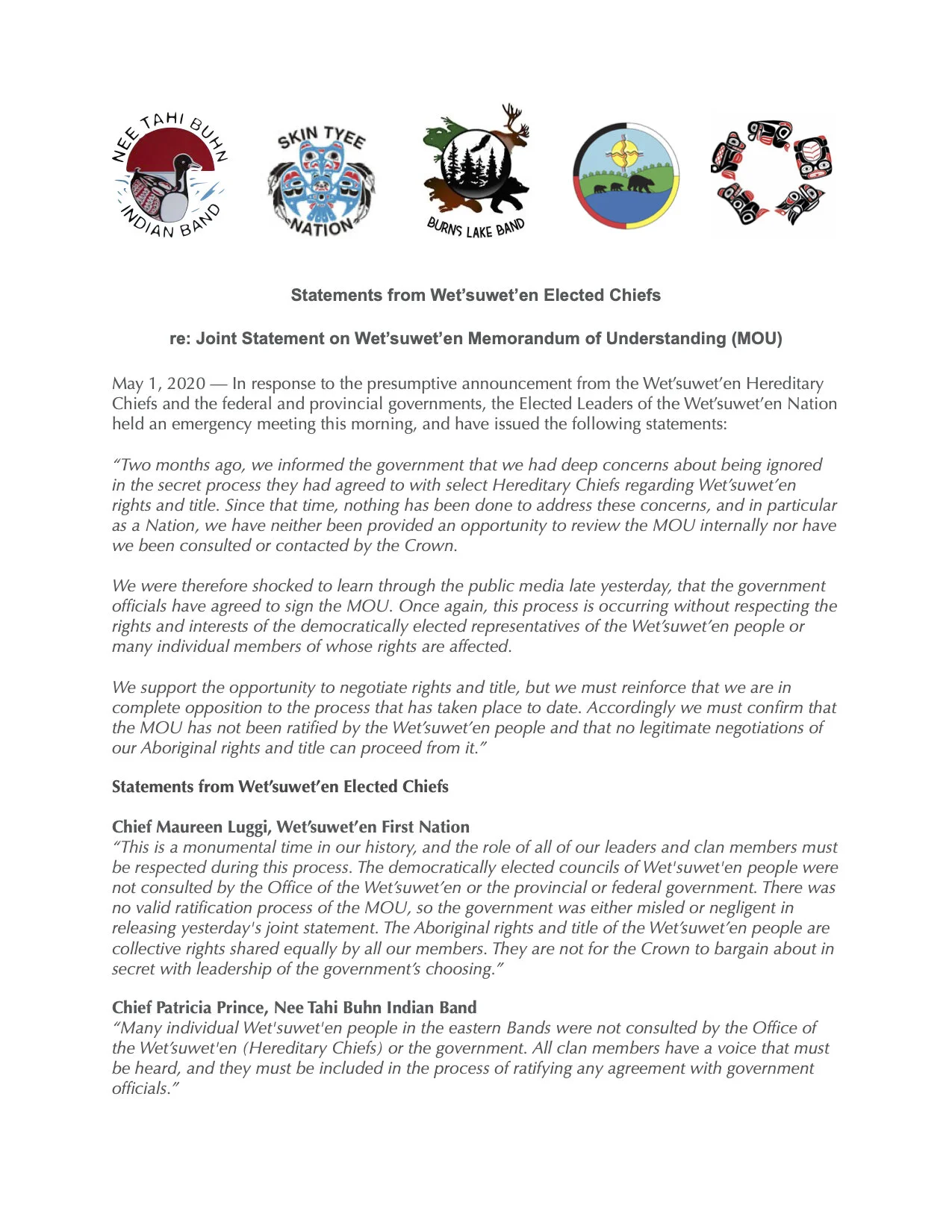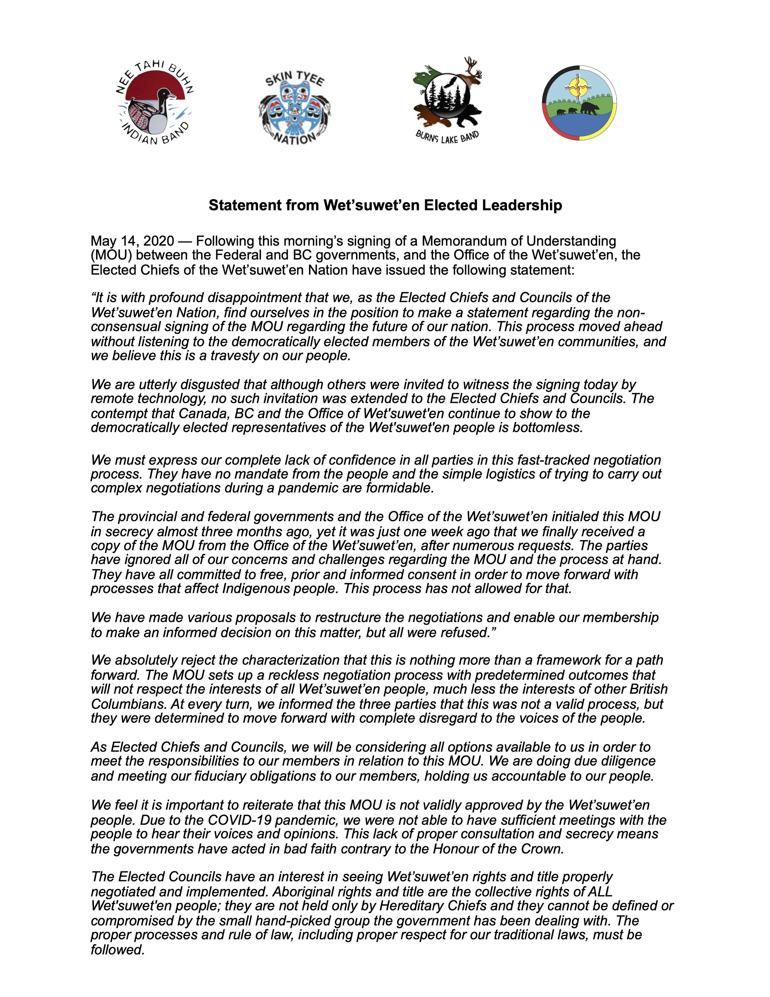 Once we have all had the opportunity to review the proposed agreement, we will work with the Hereditary Chiefs to ensure all members’ concerns are addressed before it moves forward.